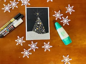 I loved the idea of using paint pens to decorate the tree. I decided to have my tree nestled into a snow bank created by using glimmer paper. There is also a tiny border of glimmer paper peeking through behind the black paper.